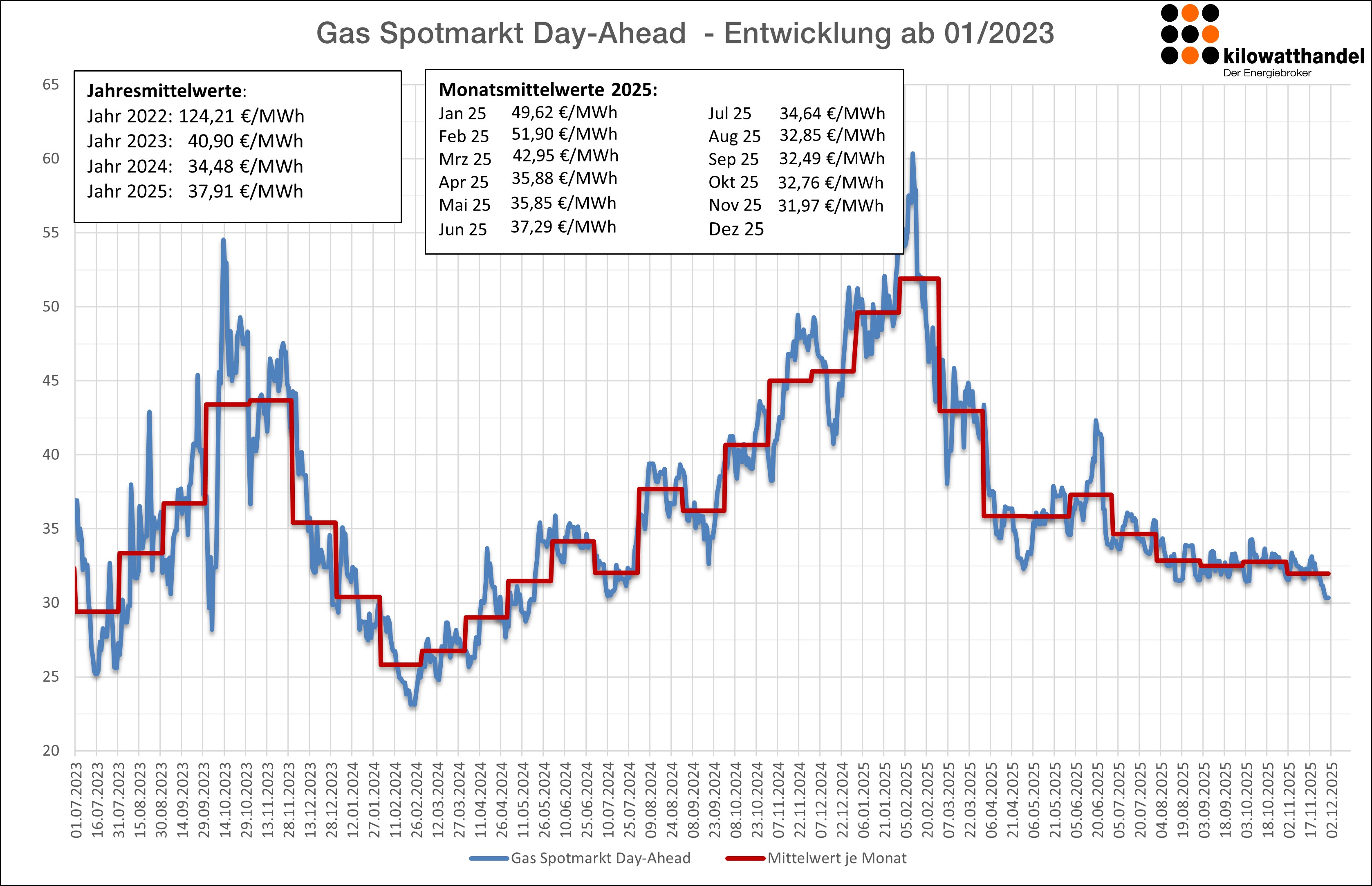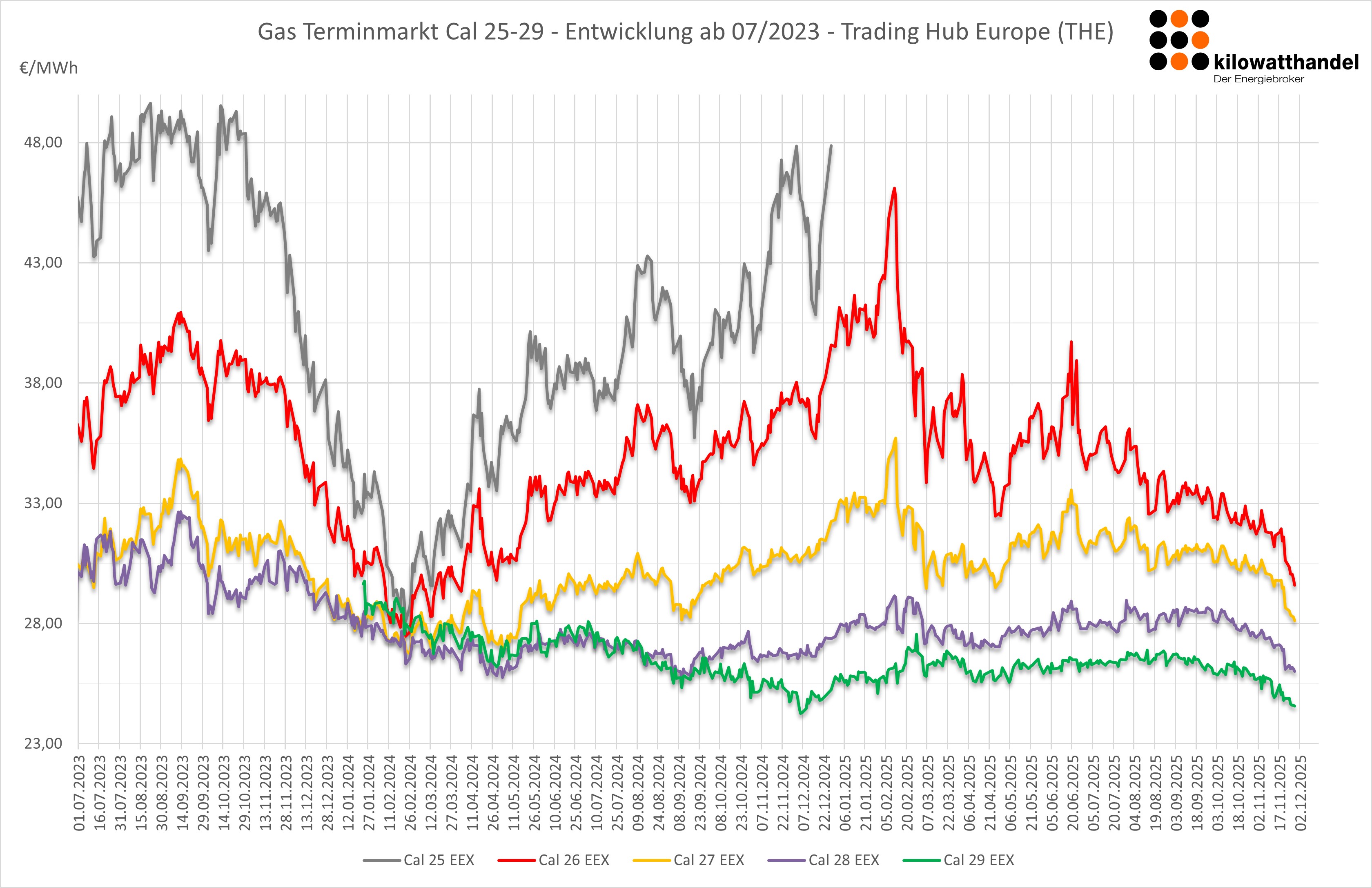 Für alle Lieferjahre sanken die Notierungen im November kontinuierlich, sodass die Notierung für 2026 zum ersten Mal die Grenze von 30 €/MWh testete.