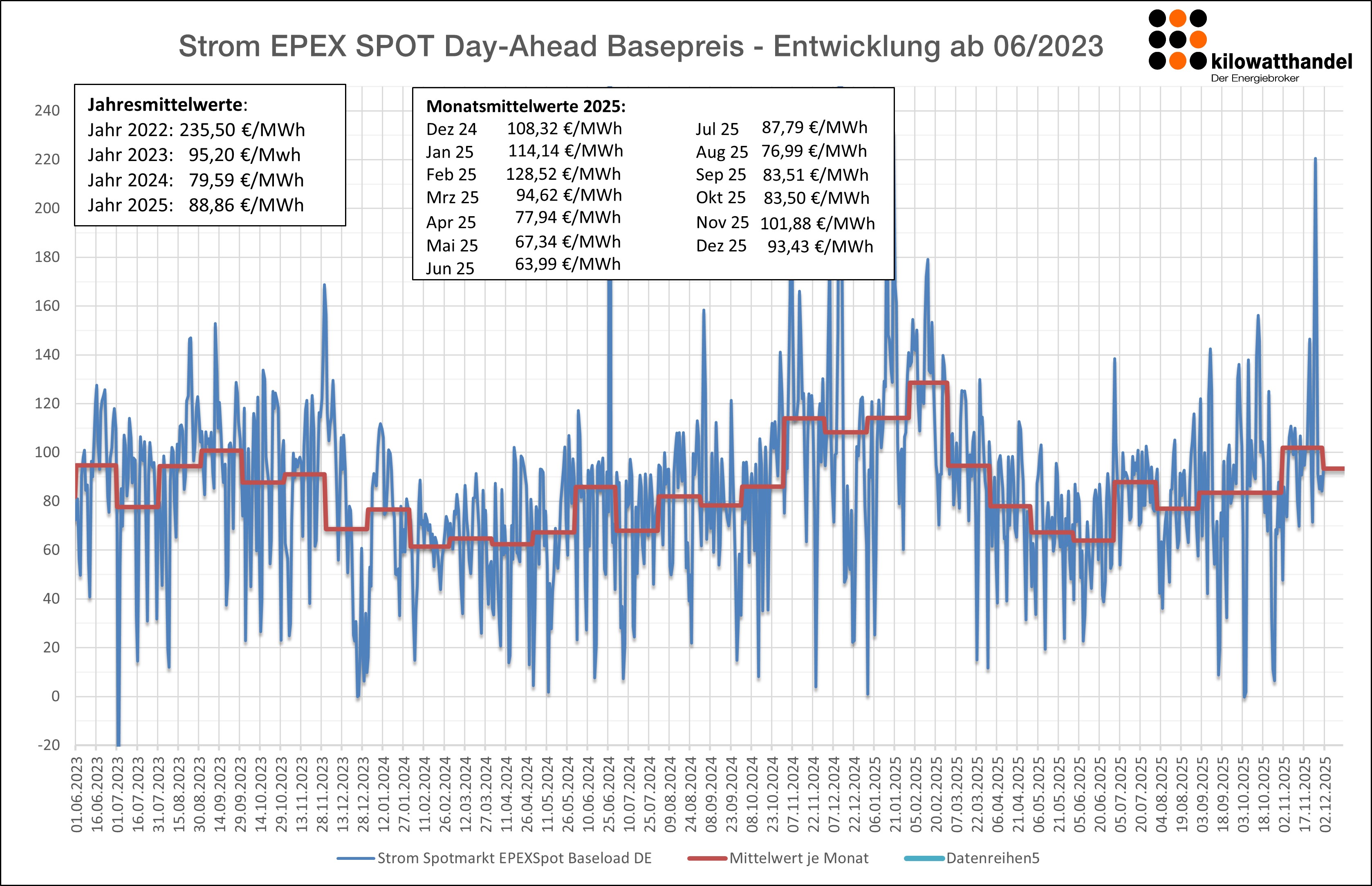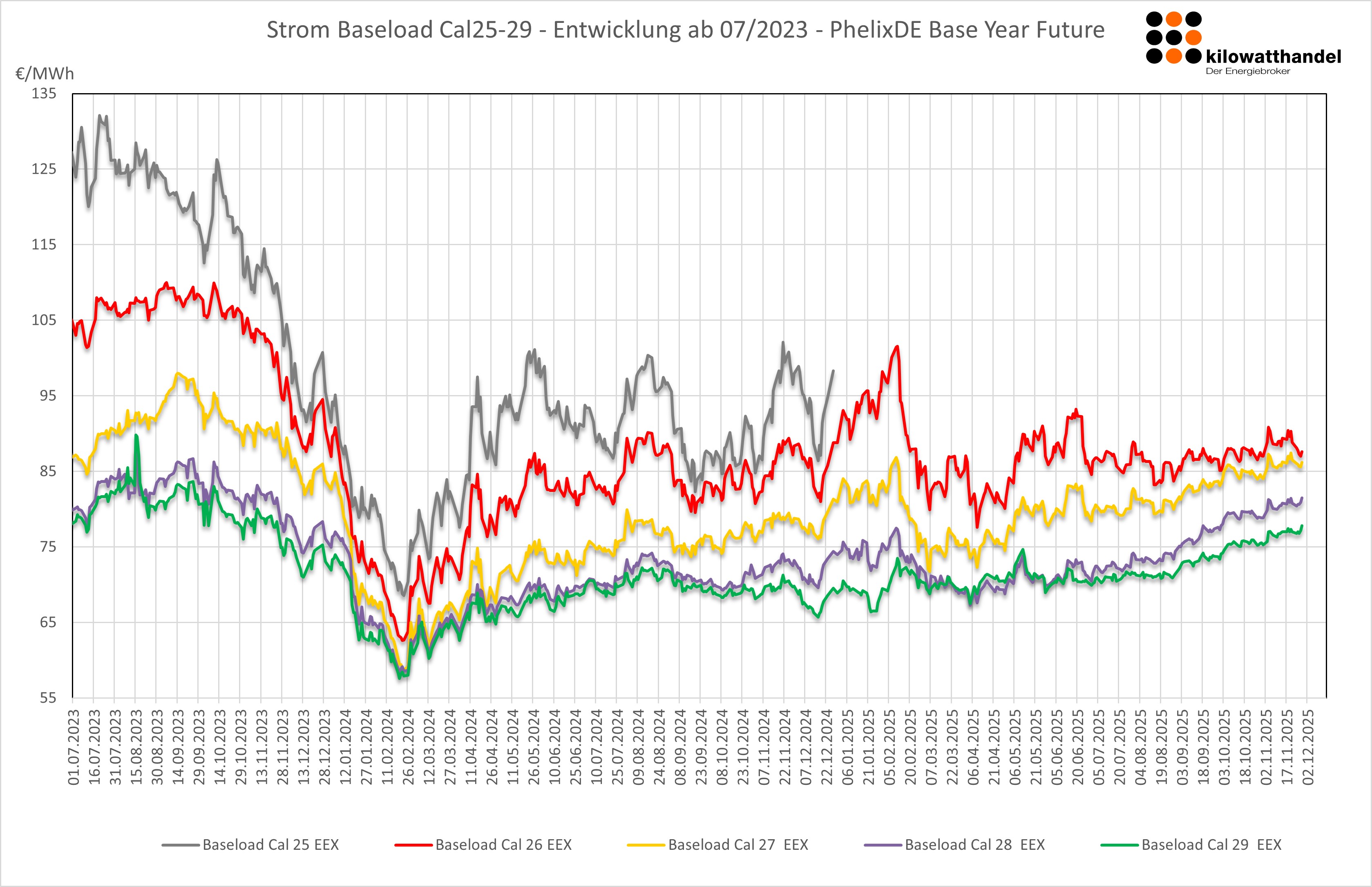 Während die Notierungen für 2026 im November leicht fielen und sich somit einige Last-Minute-Käufer günstig eindecken konnten, sieht es für die Folgejahre anders aus: für 2027 bis 2031 stiegen die Notierungen um ca. 2 €/MWh an.