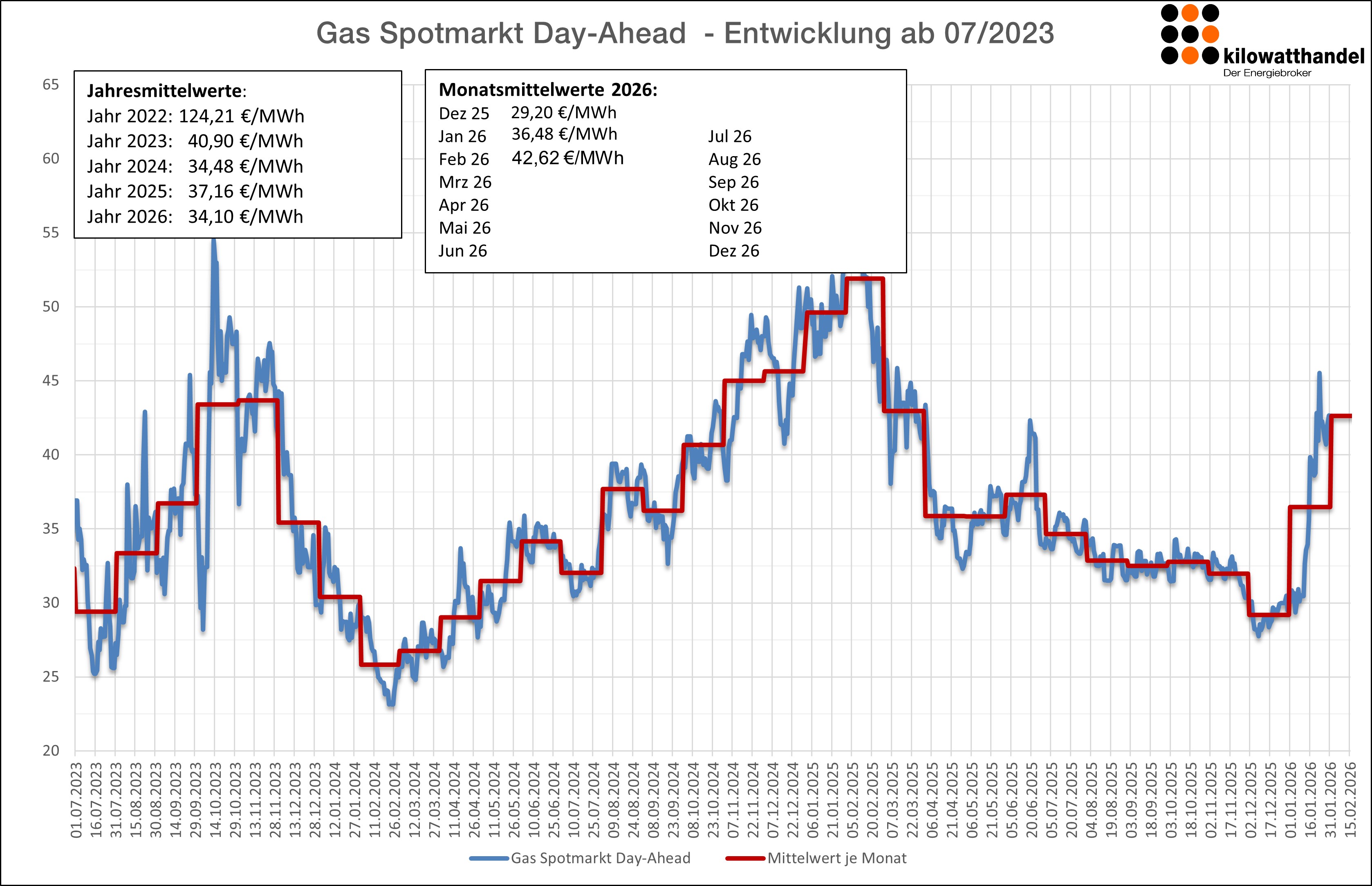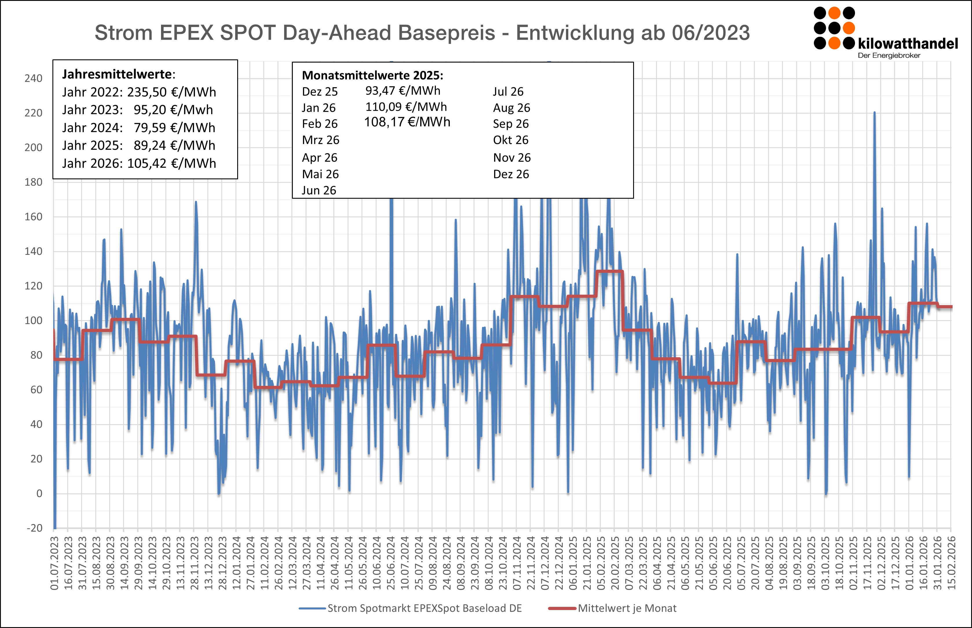 Der Spotmarkt schloss im Mittel bei 110 €/MWh. Erwartungsgemäß lag der Januar saisonbedingt im Spot recht hoch, bleibt aber unter dem Durchschnittspreis vom Januar 2025.