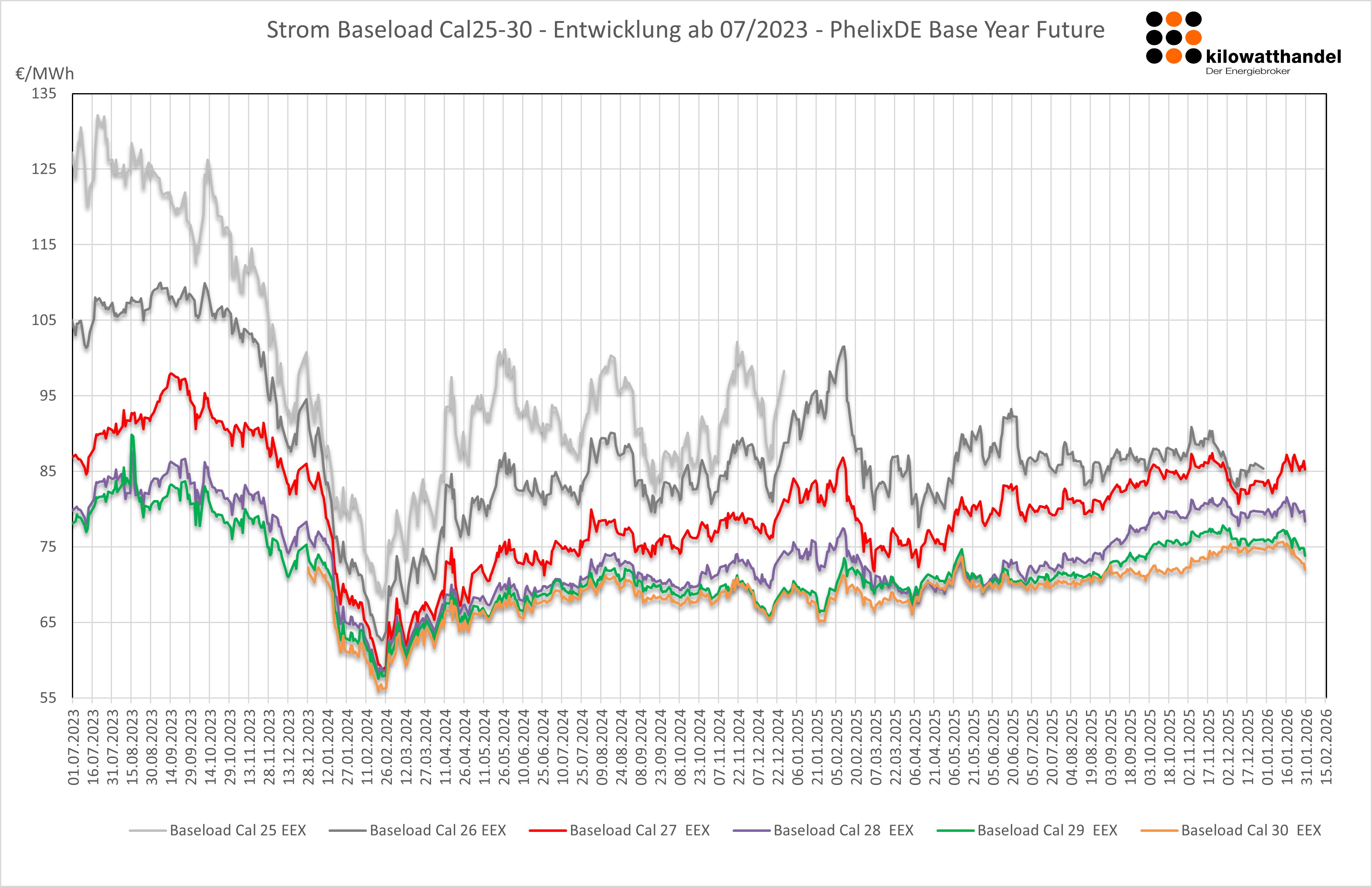 Der Strommarkt startete recht ruhig in das neue Jahr. Während die Notierungen für 2027 stabil blieben, gab es für die Folgejahre zum Monatsende Kurskorrekturen nach unten.